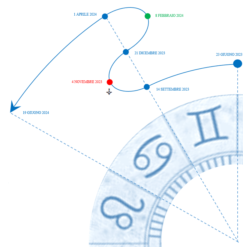 La linea blu con il suo andirivieni mette in risalto gli attraversamenti di segno che si susseguono, nel corso di un intero anno solare; è interessante notare che ci troviamo ad un punto di svolta cruciale (indicato con il pallino rosso), perché da ora in poi, e per i prossimi tre mesi, fino al 8 febbraio 2024, Vesta ritorna sui suoi passi, cambiando di segno, in retrogradazione, esattamente all’inizio dell’inverno, il 21 dicembre 2023.