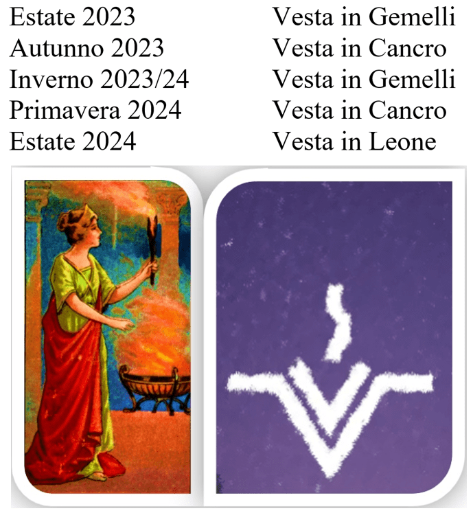 Per il restante periodo autunnale, cosa possiamo dire della permanenza del Fuoco di Vesta nell’Acqua del Cancro? E durante l’inverno, come si comporterà lo stesso Fuoco in transito nell’Aria dei Gemelli? Ed infine, in primavera, come sarà il ritorno di Vesta nel segno del Cancro? Sono tutte questioni che chiedono di essere risolte, e pertanto saranno affrontate nei prossimi mesi, una alla volta, ma per il momento riassumiamo tutto in uno specchietto sintetico: