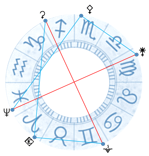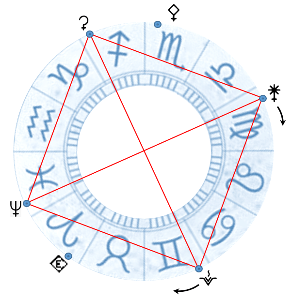Questo fatto, di riflesso, attraverso il sestile, porta il nostro Fuoco Sacro, Vesta, a intensificare il canale di ritorno, il quinconce rigenerativo, con il conseguente aumento della luce dell’intuizione di Pallade; l’energia che scorre lungo questo lato dello Yod è Mercurio, governatore dei Gemelli, ma anche, esotericamente dello Scorpione.
