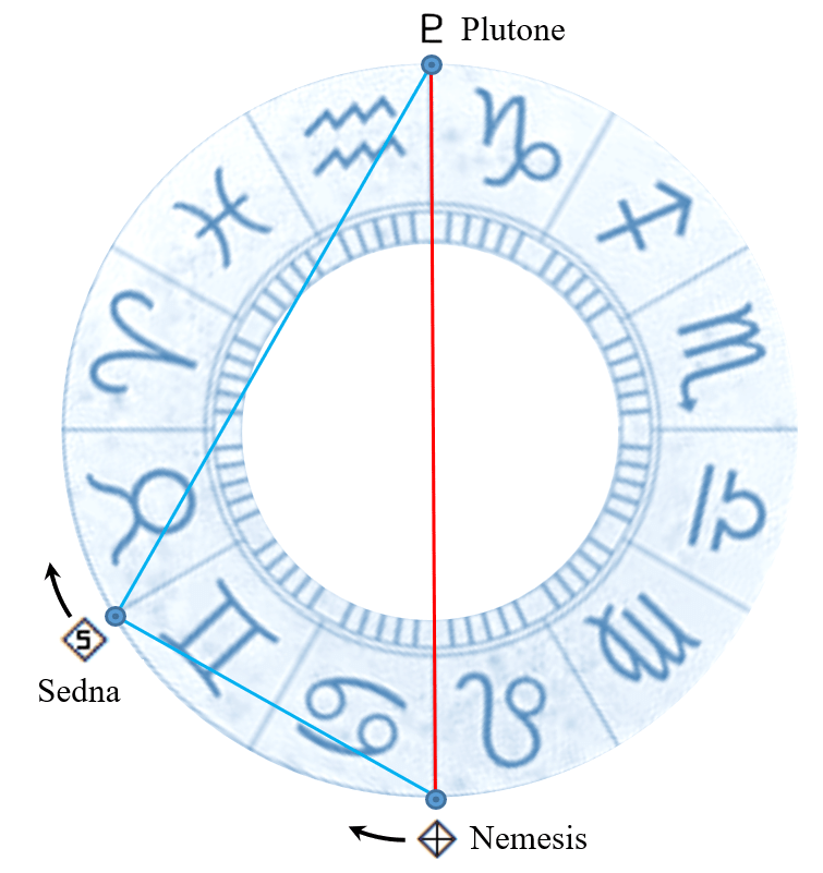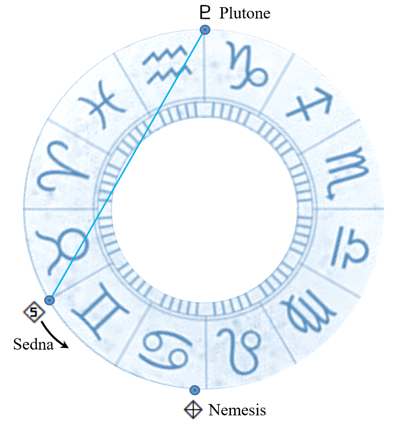 Questo transito di opposizione, di confronto e di severo giudizio, viene amplificato, nei sui effetti, dalla posizione di Sedna, retrogrado nel segno del Toro, il quale va a formare un triangolo (armonico, con trigono e sestile) proprio con Plutone e Nemesis.