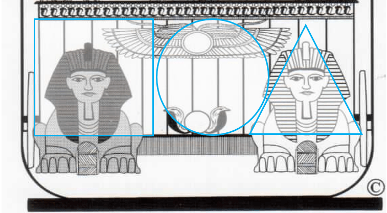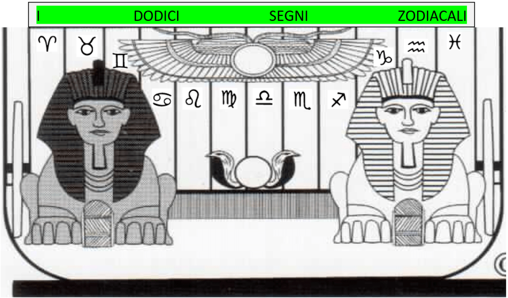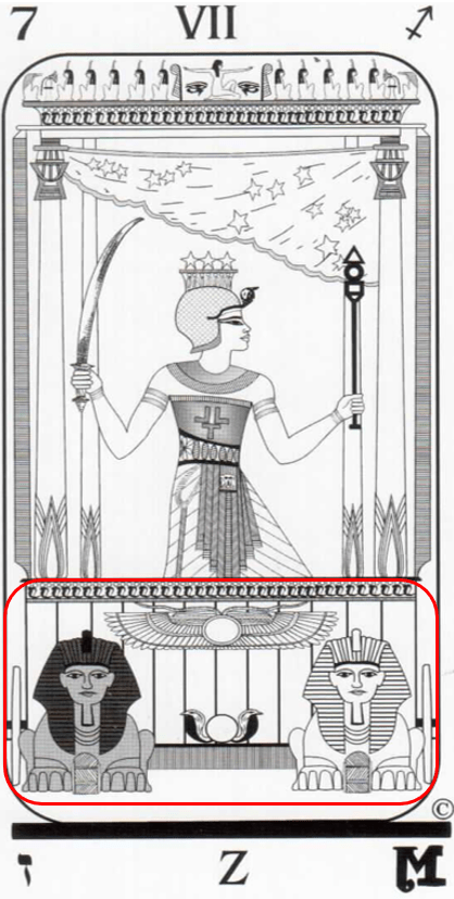 Stando così le cose comprendiamo la sua importanza all’interno della parte bassa della carta del Conquistatore, che ha una corrispondenza precisa con i dodici segni zodiacali; eccoli presentati nelle dodici strisce verticali, che costituiscono lo sfondo della figura: la Sfinge nera comprende i primi quattro segni zodiacali, mentre la Sfinge bianca, invece, corrisponde agli ultimi quattro.