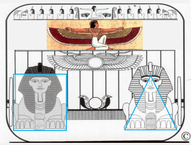 Al posto del Conquistatore abbiamo inserito la dea Maat; la sua figura, umana e divina, dotata di braccia e di ali, è l’esatta sintesi di ciò che sta sopra e sotto di lei.