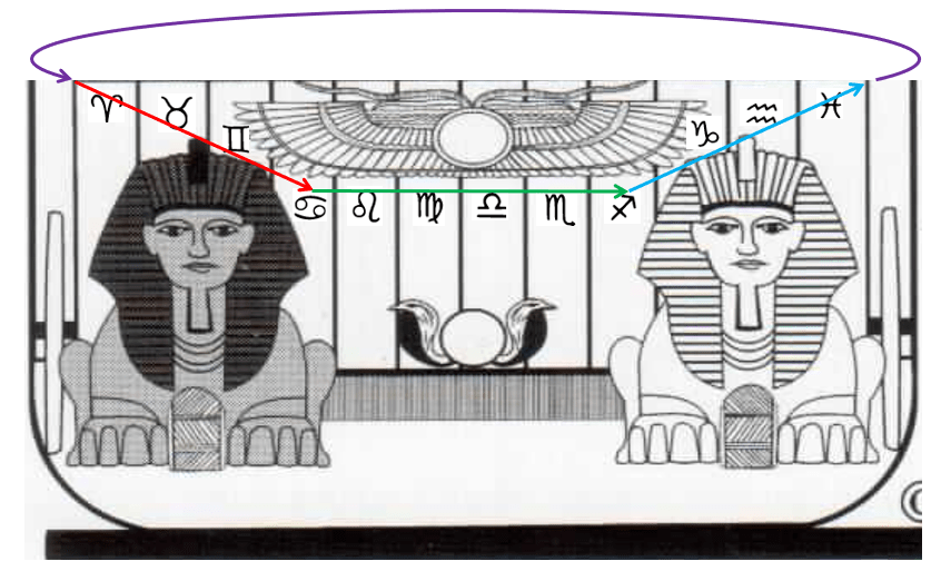 Come vediamo questa linea coinvolge sei segni, ovvero metà dello Zodiaco, e anche metà anno, perché indica il periodo dell’anno che va dall’inizio dell’estate all’inizio dell’inverno, da solstizio a solstizio, rimarcando le due linee che ritroviamo, come promemoria macroscopico, rispettivamente nel Tropico del Cancro e del Capricorno.