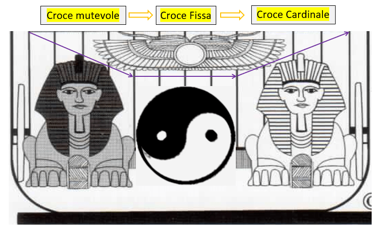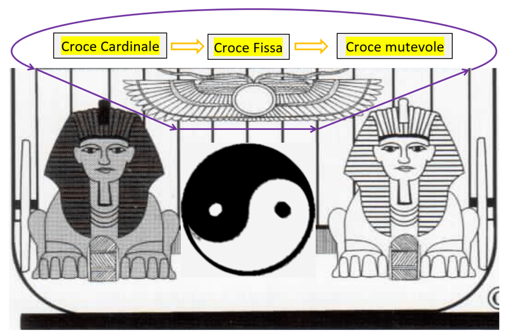 Diverso è il discorso se invece immaginiamo di rispettare la naturale sequenza delle croci, così come ci viene indicata dai segni zodiacali (Ariete, segno Cardinale – Toro, segno Fisso – Gemelli, segno Mutevole).