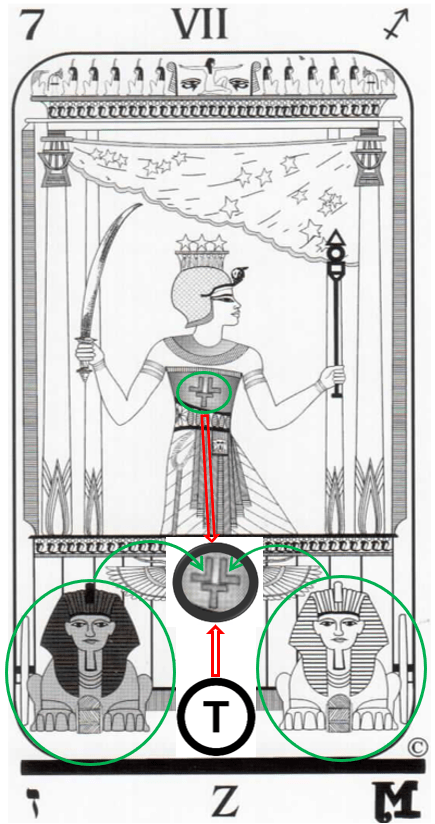 Non sfugga il fatto che sul petto del Conquistatore è presente proprio questo simbolo triplo, che riproduce la dualità di bianco e nero, ed il loro superamento, che è proprio il simbolo del Tau, ovvero la lettera T; in realtà, questo simbolo racchiude altri misteri, ma per parlarne diffusamente è necessaria qualche altra informazione preliminare.