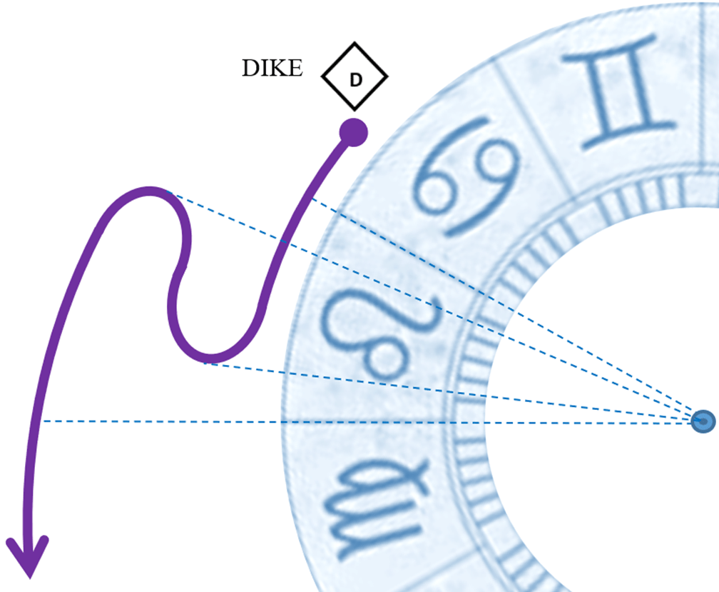 Con l’arrivo dell’estate, il 27 giugno 2024 Dike entrerà nel segno della Vergine, ma prima di allora ci saranno parecchie interazioni tra Dike, Nemesis, Hybris e Sedna, e conseguenti finestre di opportunità per intervenire nelle dinamiche della giustizia e della legge, della prepotenza e della sofferenza.