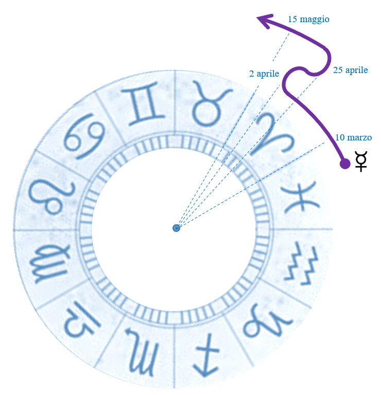 Mercurio diventa retrogrado il 2 aprile a 27°Ariete, quando ha già attraversato quasi tutto il segno, e poi ritorna indietro fino a metà, precisamente a 16°Ariete, posizione dalla quale il 25 aprile riprenderà il suo moto diretto; questo porterà Mercurio ad entrare nel segno del Toro il 15 maggio, mentre il Sole, come sappiamo, sarà già nel segno dal 21 aprile; Venere entrerà nel Toro, segno zodiacale che governa, il 30 aprile.