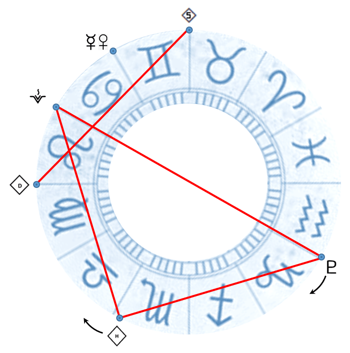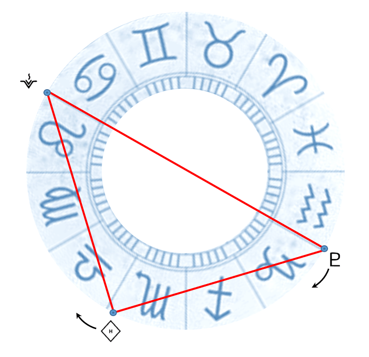 Assistiamo pertanto nei cieli alla formazione di un triangolo, nel quale il terzo lato è rappresentato dalla quadratura tra Hybris e Plutone, iniziata un mese fa, il 19 maggio, aspetto che si protrarrà per un altro mese, fino al 27 luglio.