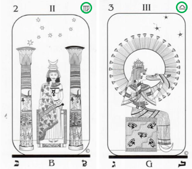 Non sfugga anche il sottile collegamento simbolico con le carte dei Tarocchi egiziani, dove la carta n°2, la Papessa, legata alla Vergine, è chiamata anche Iside Velata, mentre la n°3, l’Imperatrice, legata alla Bilancia, è conosciuta con il nome di Iside Svelata.
