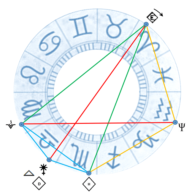 Pertanto Psyche si relaziona direttamente con entrambi i vertici “bassi” dello Yod tetraedrico, ovvero con le due energie che nell’economia dello Yod sembrano essere alleate contro il “nemico comune” Eris, che invece si trova nel vertice alto.