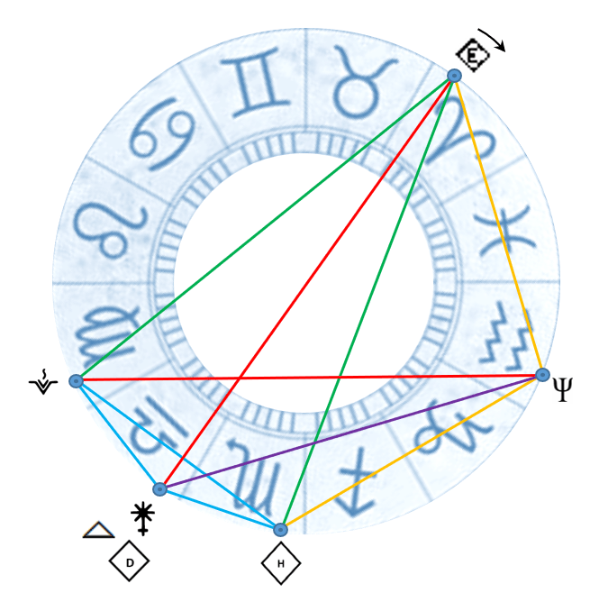 La sesquiquadratura tra Vesta e Psyche, permette a quest’ultimo asteroide di relazionarsi con gli estremi del quinconce di ingresso, quello che ha bisogno di essere corretto; di fatto, Psyche opera direttamente sulla tematica dello Yod dal suo sorgere iniziale.