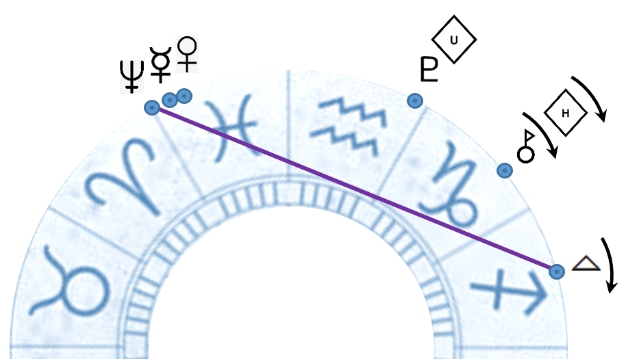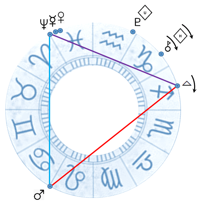In quella posizione formerà effettivamente un trigono con Nettuno, mentre adesso questo aspetto è solamente figurativo, ma possiamo, attraverso la presa di coscienza espressa dal quadritrigono, anticiparne gli effetti e sciogliere alcuni nodi che imbrigliano la nostra energia e creatività.