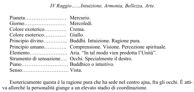 Il Quarto Raggio ha diversi epiteti, ma il più importante per il nostro studio è il Divino Intermediario (tra i tre Raggi Maggiori e i rimanenti tre Minori); ora, pensiamo che la mente è il giusto intermezzo tra i mondi superiori, dello Spirito, e quelli inferiori della personalità.