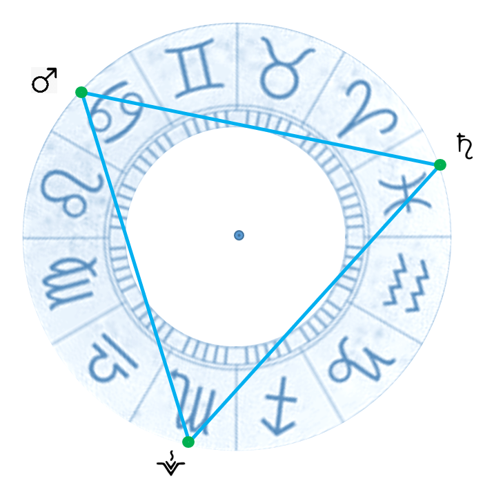 Infatti, dal 14 febbraio fino al 28 marzo Marte forma un trigono con Vesta, in transito nel segno dello Scorpione; inoltre, dal 30 gennaio al 20 aprile, un altro transito, questo molto più lungo del precedente, vede coinvolti Marte e Saturno, in un trigono tra i segni del Cancro e dei Pesci.