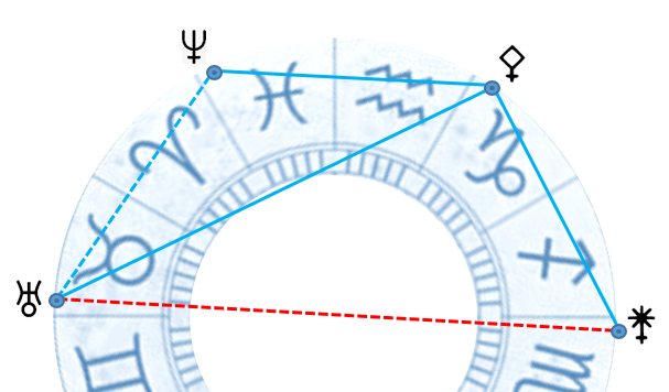 Questo doppio sestile si forma proprio mentre decade l’opposizione tra Urano e Giunone, indicata per questo motivo con un linea tratteggiata, così come il trigono tra Urano e Nettuno, aspetto ormai superato, che non ritornerà più per molti anni.
