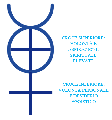 Ora comprendiamo come mai nel simbolo di Admetos è ripetuta, e in questo modo enfatizzata, la croce; infatti, si tratta della Croce Fissa, retta da Saturno, e dei suoi due bracci, che ripropongono le due dinamiche indicate sopra; si può vivere in “chiave bassa”, con poca volontà personale e molto desiderio, e in questo caso la croce di riferimento è quella inferiore, oppure si può elevare sia la propria volontà che la propria aspirazione, e trasferire la propria coscienza alla croce presente dentro alla circonferenza.